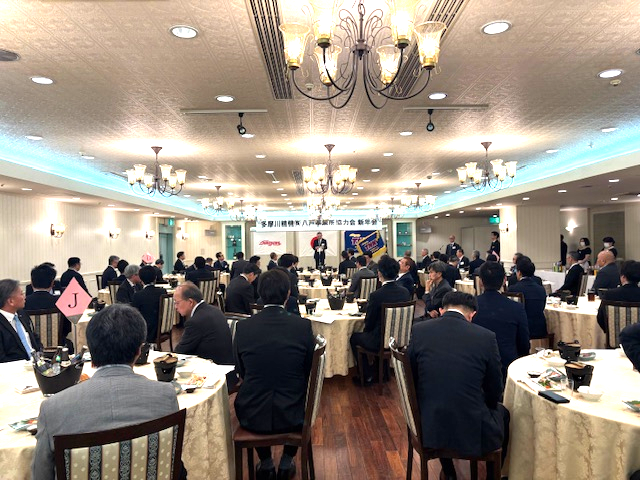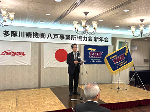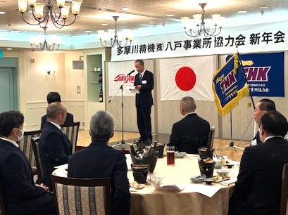 当社八戸事業所の取引企業でつくる多摩川精機株式会社八戸事業所協力会の2025年新年会が2月10日(月)、青森県八戸市内で開かれました。会員企業29社のうち、24社の計49名が出席。当社からは松尾忠則社長ら16名が参加し、さらなるご支援をお願いしました。