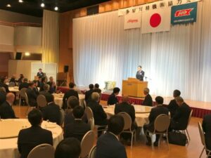 協力会の馬場敏夫会長(寺師産業株式会社社長)のあいさつに続き、松尾社長は昨今の災害事例を交え、自然や地政学、サイバーなどさまざまなリスクへ備える重要性を強調。2025年の受注・売上の実績報告では、製造力の改善に取り組む姿勢を伝えました。